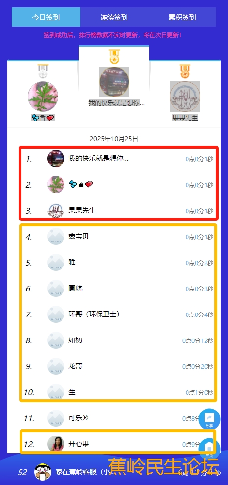 今天(10月25日)农历九月初五【逢二、五、八为新铺圩日】签到榜排名前十名坛友和签到榜逢2、5、8尾数的奖励开心红包一个。