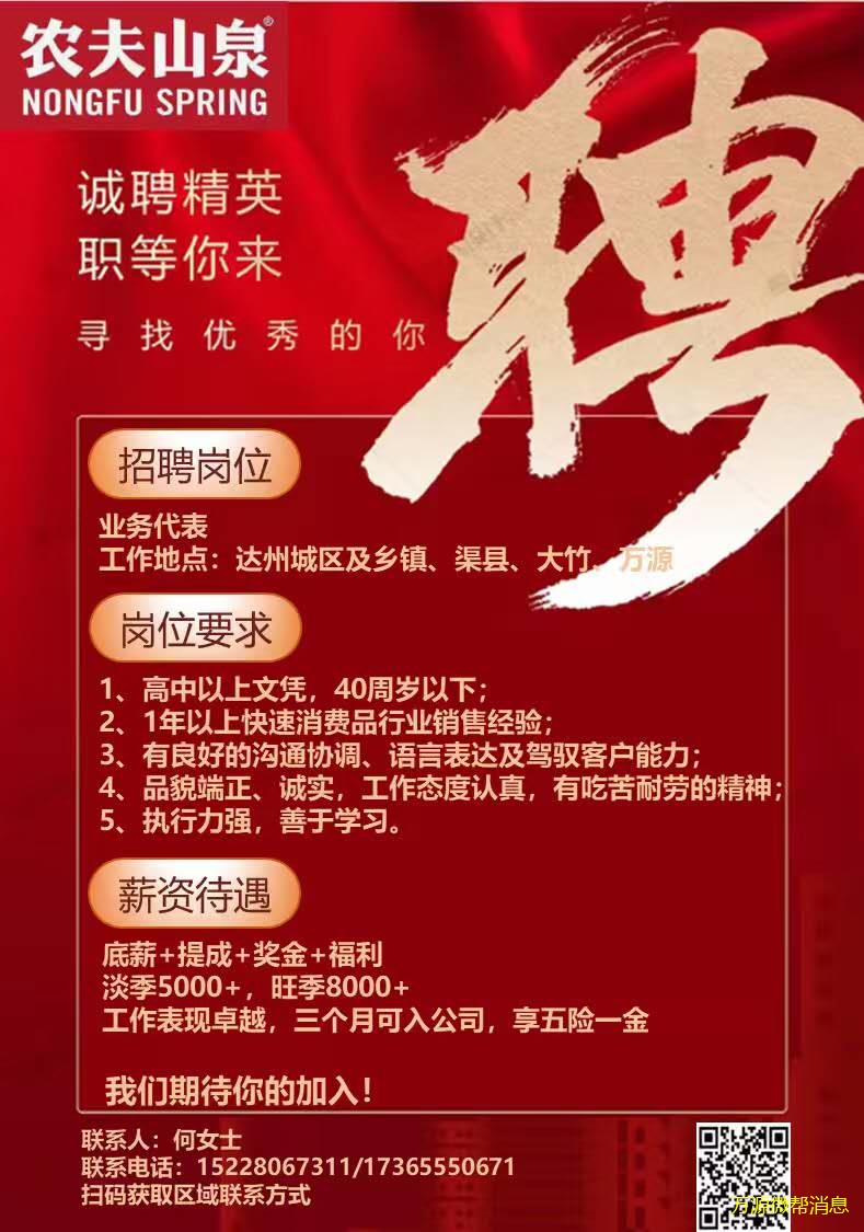 招聘岗位业务代表工作地点:万源乡镇+城区岗位要求1、高中以上文凭,40周岁以下;2、1年以上快速消费品行业销售经验;3.有良好的沟通协调、语言表达及驾驭客户能力;4品貌端正、诚实,工作态度认真,有吃苦耐劳的精神;5、执行力强,善于学习。薪资待遇底薪+提成+奖金+福利转正后淡季5000+,旺季8000+工作表现卓越,三个月可入公司,享五险一金,我们期待你的加入!联系人:何女士联系电话:15228067311/17365550671