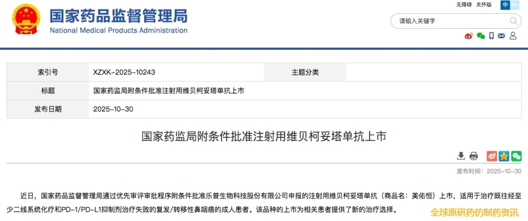 2025年10月30日,国家药品监督管理局通过优先审评审批程序附条件批准乐普生物科技股份有限公司申报的注射用维贝柯妥塔单抗(商品名:美佑恒)上市,适用于治疗既往经至少二线系统化疗和PD-1/PD-L1抑制剂治疗失败的复发/转移性鼻咽癌的成人患者[1]。