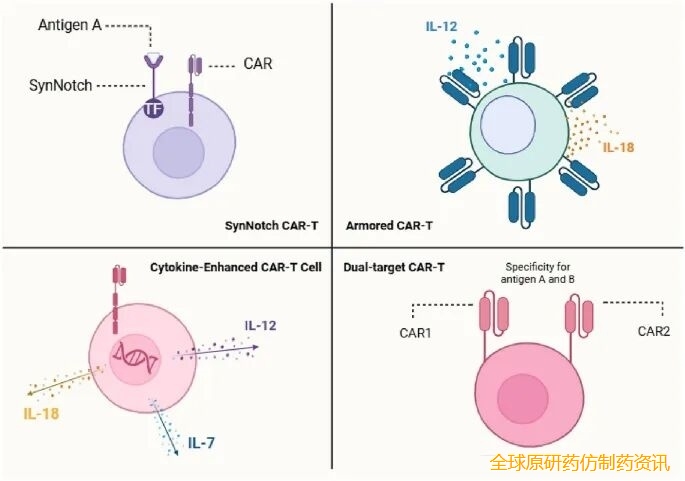 为进一步提升疗效,研究者开发了更智能的 CAR-T 技术,展示了 4 类核心创新设计: