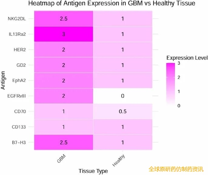 图 2:热图清晰对比各靶点在 GBM 与正常组织的表达差异,IL13Rα2、EGFRvIII、B7-H3 等靶点在肿瘤中高表达(数值 2-3,紫色深),正常组织中低表达(数值 0-1,紫色浅),印证靶向安全性。