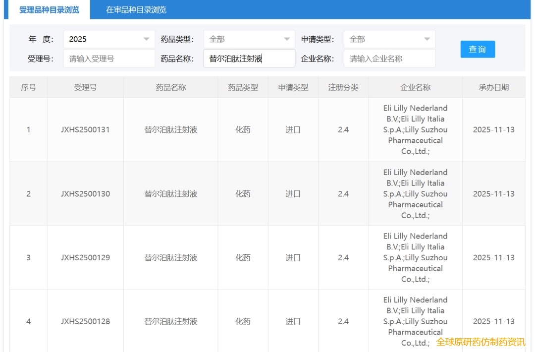 2025年11月13日,CDE官网显示,礼来(Eli Lilly)的葡萄糖依赖性促胰岛素多肽(GIP)/ 胰高糖素样肽 - 1(GLP-1)双受体激动剂替尔泊肽注射液(穆峰达)新适应症上市申请已获得受理。作为全球首个GIP/GLP-1双受体激动剂(单分子多肽类药物),替尔泊肽于2022年5月首次获FDA批准上市,用于治疗2型糖尿病。2024年5月,替尔泊肽首次在我国获批上市,截止至目前共在中国获批8个规格,3项适应症:- 2024年5月——适用于成人2型糖尿病患者的血糖控制:在饮食控制和运动基础上,接受二甲双胍和/或磺脲类药物治疗血糖仍控制不佳的成人2型糖尿病患者。在饮食控制和运动基础上,联合胰岛素(伴或不伴口服降糖药)治疗,改善成人2型糖尿病患者的血糖控制。