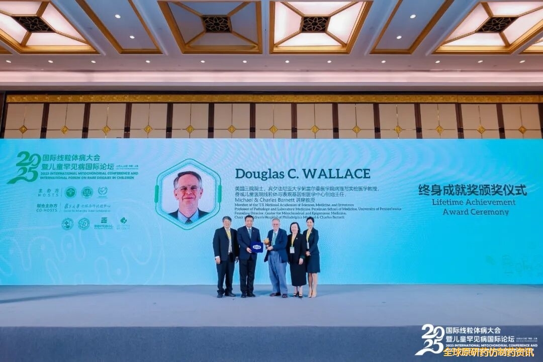 黄涛生教授为美国三院院士,宾夕法尼亚大学佩雷尔曼医学院病理与实验医学教授,费城儿童医院线粒体与表观基因组医学中心创始主任Douglas C. WALLACE颁发终身成就奖。他被誉为“线粒体之父”,其研究首次将人类疾病与线粒体DNA突变关联,开创了线粒体遗传学领域,揭示了线粒体功能从罕见病到常见衰老性疾病的广泛影响,奠定了现代线粒体医学的基石。