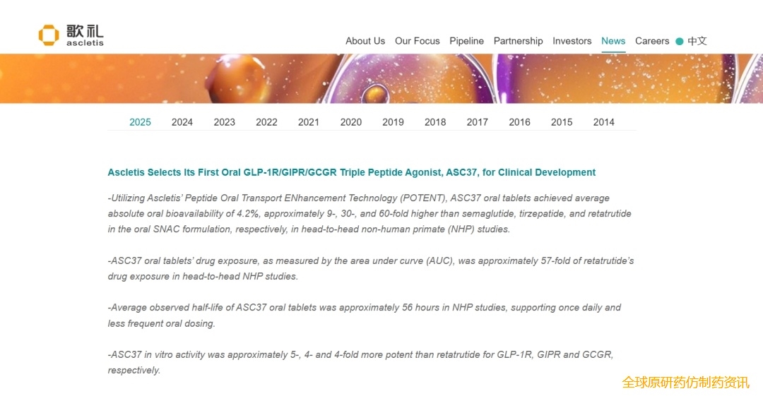 11月30日,歌礼制药(Ascletis)宣布,其利用肽类口服转运增强技术(POTENT)研发的 ASC37口服片剂在头对头非人灵长类动物(NHP)研究中平均绝对口服生物利用度达4.2%,分别较口服SNAC制剂中的司美格鲁肽(semaglutide,单靶)、替尔泊肽(tirzepatide,双靶)和瑞他鲁肽(retatrutide,三靶)高出约9倍、30倍及60倍。