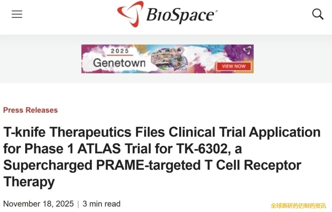 据“BioSpace”2025年11月18日报道,新一代靶向PRAME的增强型TCR-T疗法TK-6302已提交临床试验申请(CTA),拟启动I期ATLAS试验,用于治疗鳞状非小细胞肺癌、卵巢癌等存在高度未满足医疗需求的实体瘤。