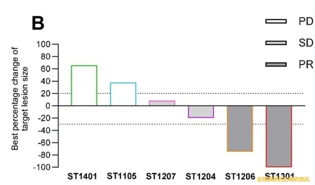 全组中位无进展生存期(PFS)为12.8周,其中1例患者在数据截止前超2年仍保持无进展状态(含非靶病灶,详见下图D);中位随访10.9个月时,2例患者输注SCG101后存活超2年。值得关注的是,ST1301患者的靶病灶位于肺部(靶肽存在情况不明),输注后18个月,该病灶在初期轻微缩小后显著退缩,同时检测到SCG 101T细胞重新出现。