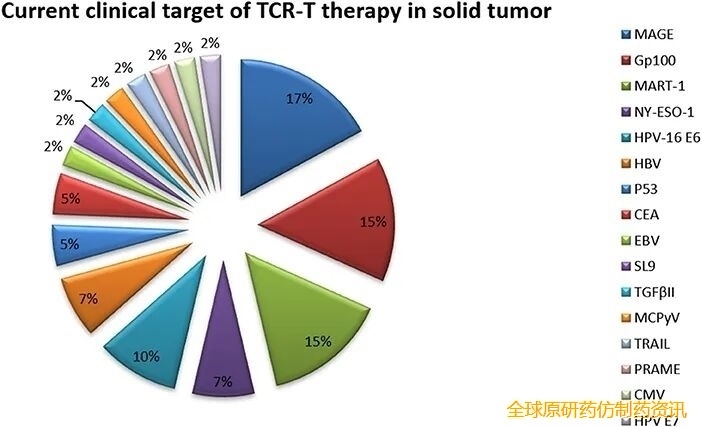 TCR-T细胞疗法(T细胞受体工程化T细胞疗法)通过基因工程技术,将抗原特异性TCR基因序列(α和β链)导入T细胞,使其可精准识别肿瘤抗原(涵盖细胞膜表面及细胞内来源的肿瘤特异性抗原)并杀伤癌细胞。得益于TCR能靶向大多数肿瘤特异性抗原(尤其是胞内抗原),目前已有多项TCR-T技术进入实体瘤临床试验阶段,实体瘤中TCR-T疗法的当前临床靶点(ClinicalTrials.gov)(详见下图)。