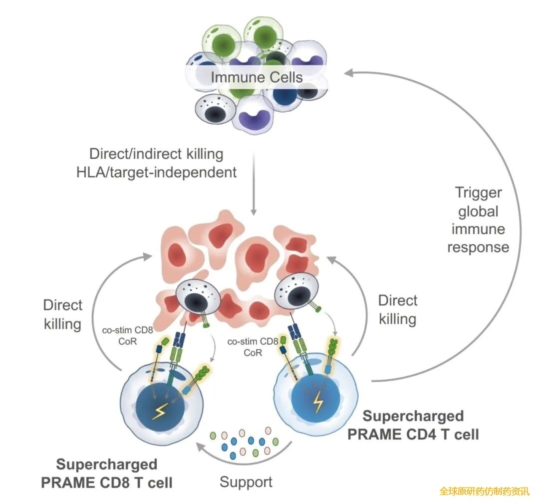 TK-6302是一款靶向PRAME的增强型TCR-T疗法,2025年癌症免疫治疗学会(SITC)年会上,摘要329海报通过临床前研究证实其抗肿瘤活性、多功能性、T细胞适应性及安全性,凭借三大核心创新技术形成差异化优势:①高亲和力TCR强化T细胞毒性;②嵌合CD8共受体(共刺激CD8CoR)结合CD4T细胞并提供共刺激信号,提升T细胞活性与持久性;③FAS-TNFR检查点转换器在淋巴结激活,增强T细胞植入能力并抵御肿瘤微环境中FAS-L诱导的凋亡,提高存活率。
