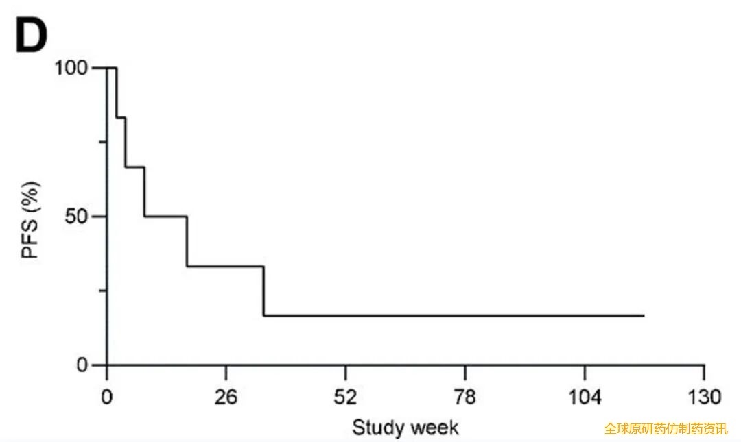 结果显示:根据改良实体瘤疗效评价标准(mRECIST),6例患者中有3例实现肿瘤缩小,靶病灶最佳缩小百分比分别为-19.5%、-74.6%、-100%:其中1例达完全缓解(CR),无进展生存期(PFS)长达27个月;2例达部分缓解(PR),缓解持续时间分别为8.0个月和≥9.5个月(详见下图C),另有2例患者病情稳定(详见下图B),研究客观缓解率(ORR)为33.3%,疾病控制率(DCR)为66.7%。