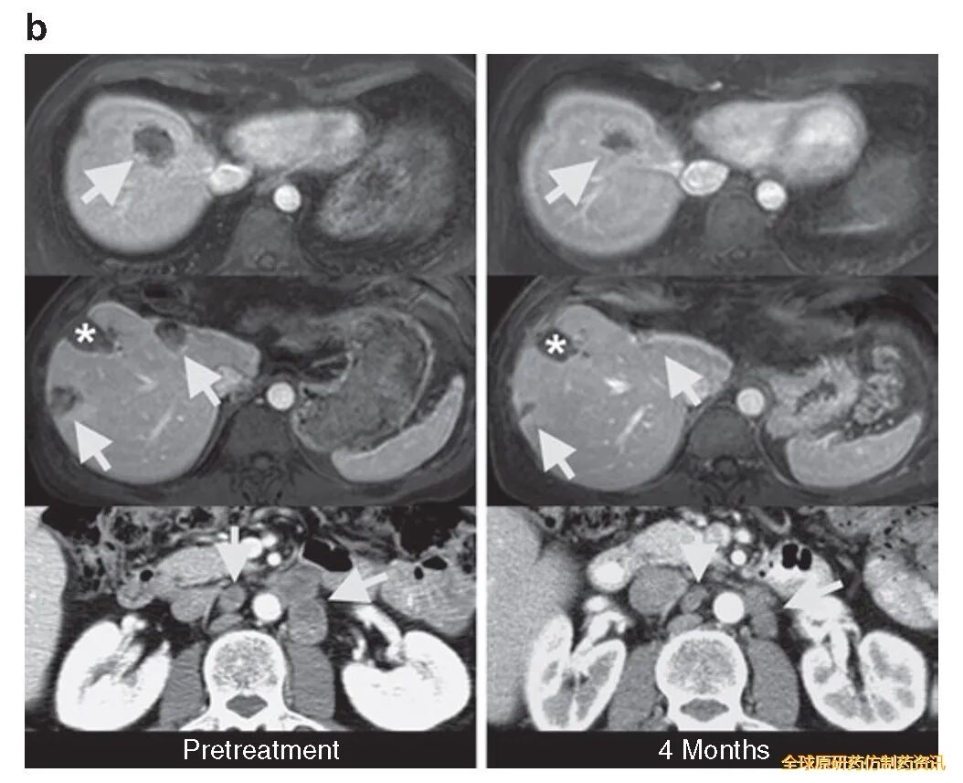 患者3在治疗3个月时,肝、肺及腹主动脉旁淋巴结转移瘤按实体瘤疗效评价标准(RECIST)缩小34%,4个月时缩小幅度达49%(详见下图),达到RECIST确认的部分缓解(PR)。