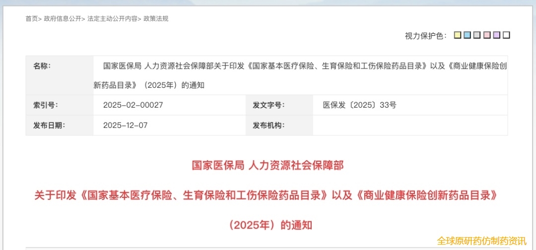 1.国家医保局人力资源社会保障部关于印发《国家基本医疗保险、生育保险和工伤保险药品目录》以及《商业健康保险创新药品目录》(2025年)的通知,国家医疗保障局官网,文章发布于2025年12月7日.
