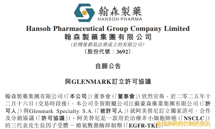 根据许可协议,翰森制药将授予Glenmark独占许可,允许其在授权区域(中东与非洲、东南亚与南亚、澳大利亚、新西兰、俄罗斯与其他独联体国家,以及协议覆盖的部分特定加勒比国家)开发并商业化阿美替尼。翰森制药将获得首付款和后续可能累计超过十亿美元的监管和商业里程碑付款,以及授权区域内净销售额的分级特许权使用费。
