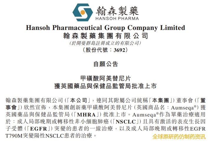 今年6月,翰森制药宣布阿美替尼获英国药品与保健品监管局(MHRA)批准上市,作为单药用于成人局部晚期或转移性NSCLC且具有激活的EGFR突变的患者的一线治疗,以及成人局部晚期或转移性EGFR T790M突变阳性NSCLC患者的治疗。这也让阿美替尼成为翰森制药首个获准进入海外市场的创新药,也是首个海外上市的中国原研EGFR-TKI。