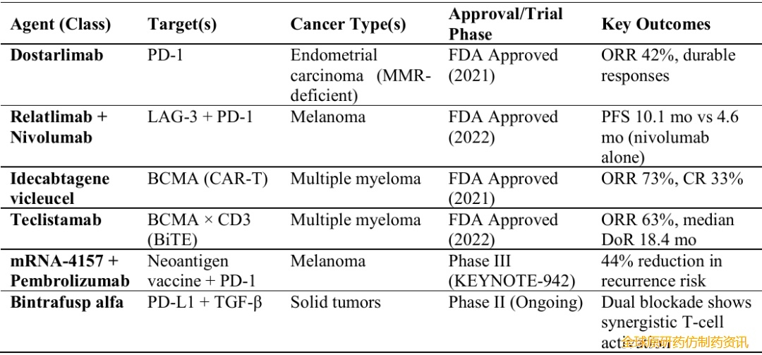 表1总结了 2019 年至 2025 年间关键的免疫疗法批准,突出了治疗类别、主要适应症和显著结果。