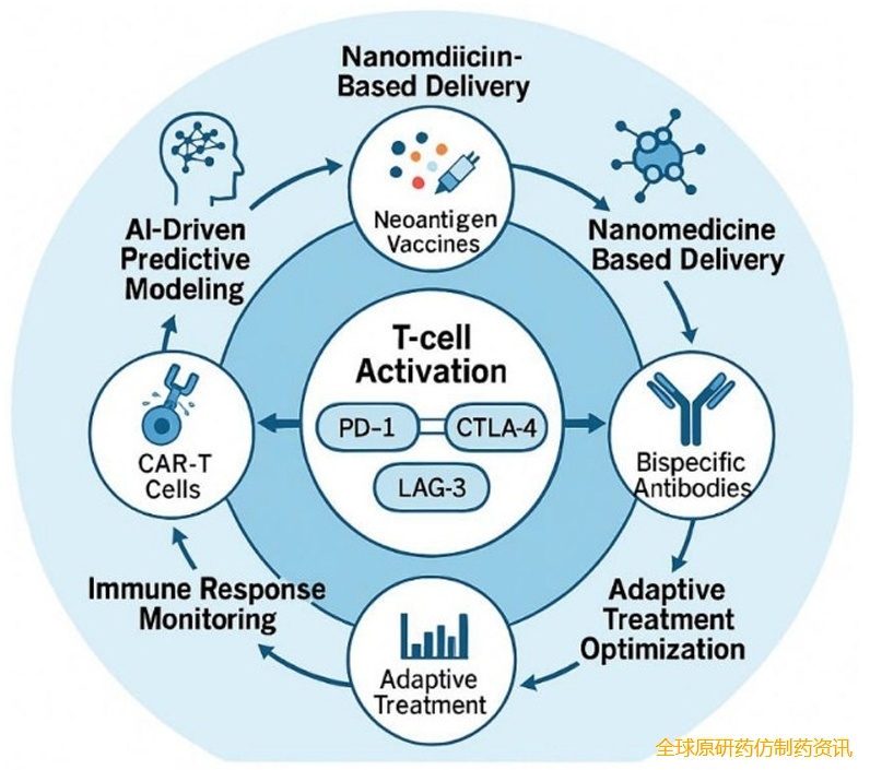 纳米医学通过增强免疫治疗药物的药代动力学、生物分布和安全性,贡献了另一个变革性维度。工程化的纳米颗粒、脂质体和聚合物胶束促进抗体、细胞因子或 siRNA 在肿瘤微环境内的靶向递送,提高治疗指数,同时减少全身暴露。能够响应 pH、氧化还原或酶触发的智能纳米载体允许原位控制药物释放,优化免疫激活动力学。此外,与基因组学、蛋白质组学、代谢组学和单细胞转录组学等多组学平台的整合,使人们能够全面理解肿瘤进化和免疫适应。这个多维框架支持设计与肿瘤动态同步演变的适应性免疫疗法方案,这一概念被称为"免疫进化精准医学"。基于 AI 的预测模型与纳米载体实现的靶向递送相结合,构成了下一代数字免疫治疗生态系统的基础。