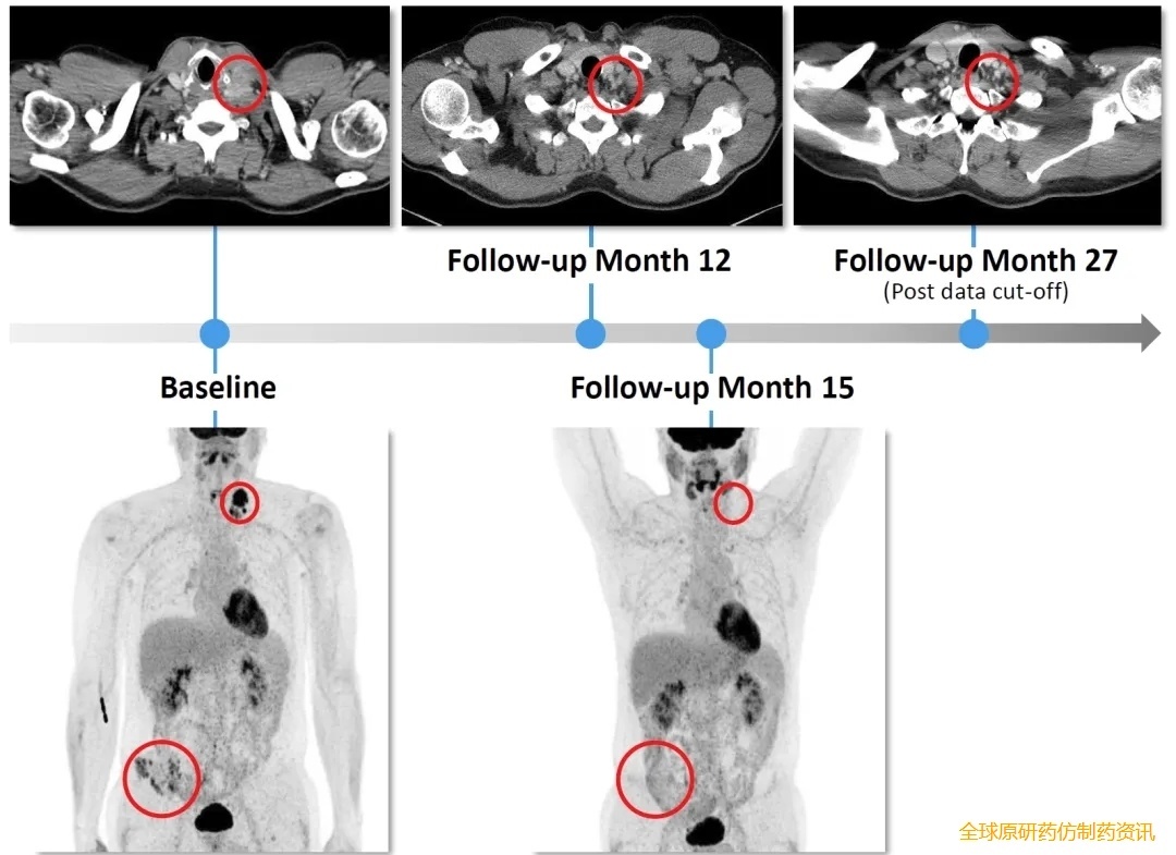 该患者有13年病史,经达拉非尼+曲美替尼等5线治疗失败,入组时颈部23mm靶病灶伴盆腔骨骼、肺部转移。接受IMA203治疗后,按RECIST1.1标准评估,24个月内持续无进展,病灶缩小78.3%;治疗15个月PET成像提示代谢CR,截至数据截止时,缓解持续超2年(详见下图)。