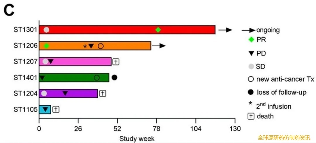 结果显示:客观缓解率(ORR)33.3%,疾病控制率(DCR)66.7%。按mRECIST标准评估,3例肿瘤缩小(最佳缩小率-19.5%~-100%),其中1例完全缓解(CR,PFS达27个月)、2例部分缓解(PR,缓解持续8.0个月~≥9.5个月,详见下图C),2例病情稳定。中位无进展生存(PFS)12.8周,1例PFS超2年(详见下图D),2例存活超2年。ST1301患者肺部靶病灶输注18个月后显著退缩,伴SCG101 T细胞重现,印证疗法持久活性。