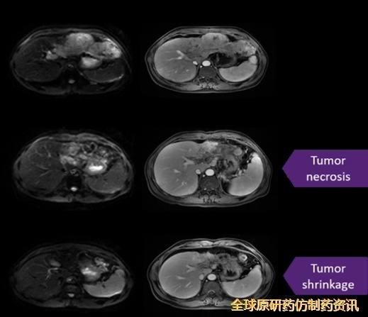 值得关注的是,其中1例患者疗效尤为突出:该患者第二剂输注后,肿瘤缩小同时出现ALT、GGT、AST及胆红素短暂3级升高,提示疗法具有明确靶向效应,且肝脏肿瘤显著缩小超30%,持续30个月(详见下图)。