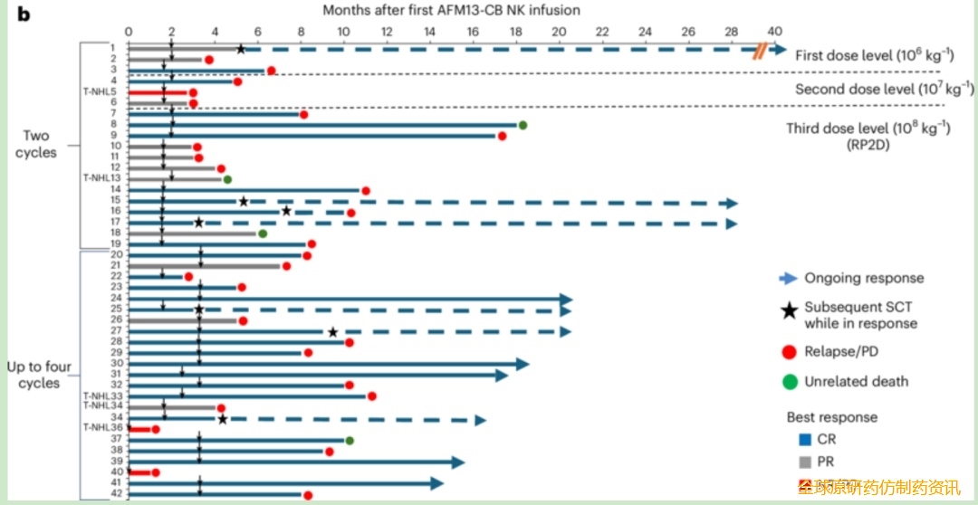 AFM13是一款靶向CD30/CD16A的双特异性抗体,可通过激活NK细胞精准杀伤CD30⁺肿瘤细胞。2025年4月,国际顶尖期刊《Nature Medicine》重磅发布了其Ⅰ期临床试验(NCT04074746)的震撼数据:这项针对42例多线治疗失败的难治性复发性淋巴瘤患者的研究,采用“淋巴细胞清除治疗(2-4个周期)+AFM13-NK细胞输注”方案。