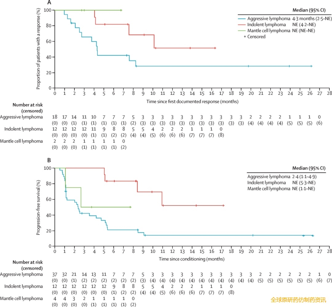 结果显示:55例患者的客观缓解率(ORR)达58%(32/55),抗肿瘤活性强劲。无进展生存期(PFS)分层分析结果亮眼:侵袭性淋巴瘤PFS为2.4个月(范围:1.1-4.9个月);惰性淋巴瘤与套细胞淋巴瘤的PFS均未达到(详见下图),提示部分患者或可实现长期疾病控制。