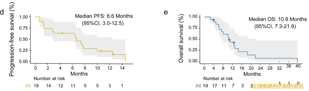 在生存数据方面,19例可评估患者中位无进展生存期(mPFS)6.6个月(95%CI,3.0–12.5,详见下图d),中位总生存期(mOS)10.8个月(95%CI,7.3–21.9,详见下图e)。