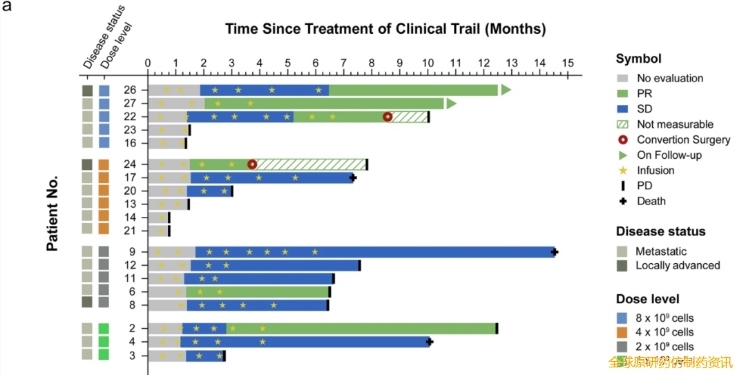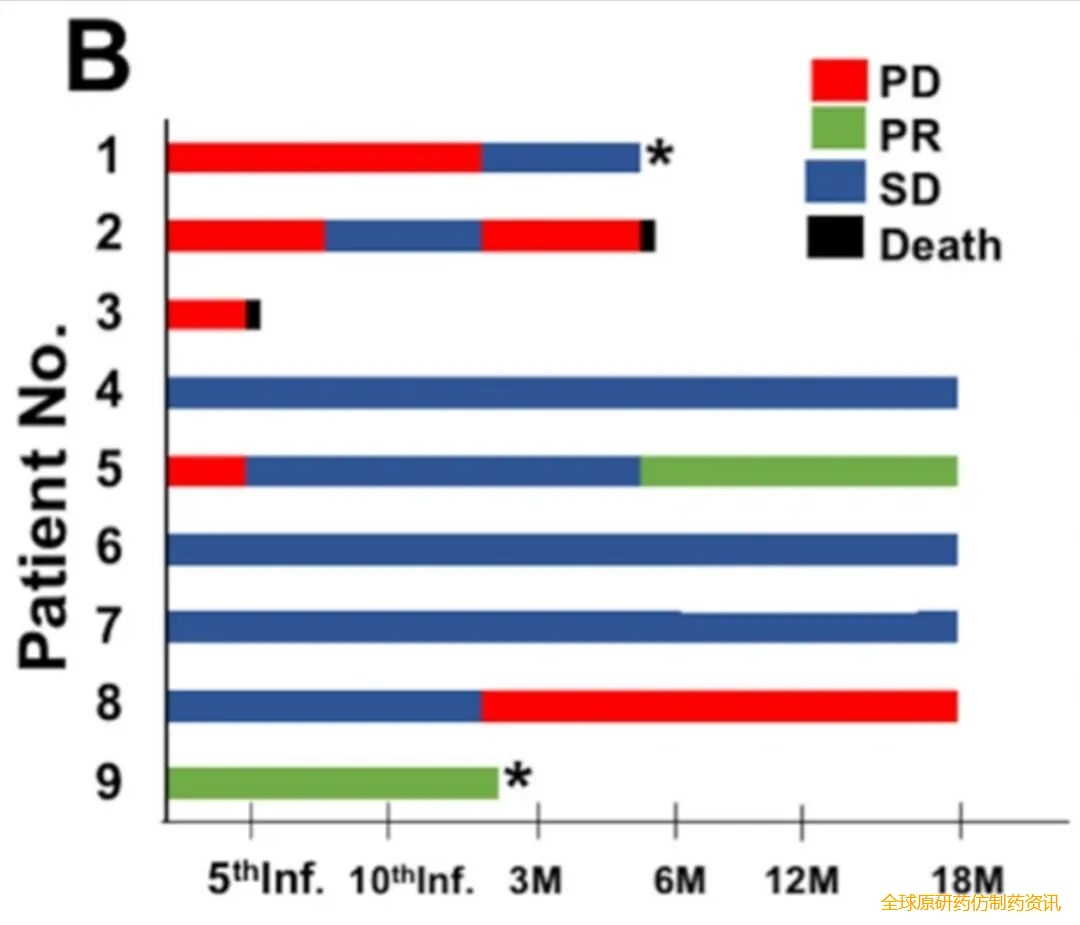 结果显示:干预组9例患者中5例对治疗产生反应,包括3例病情稳定(SD)、2例部分缓解(PR)。截至2024年8月7日随访满18个月时,干预组仍有5例患者存活。