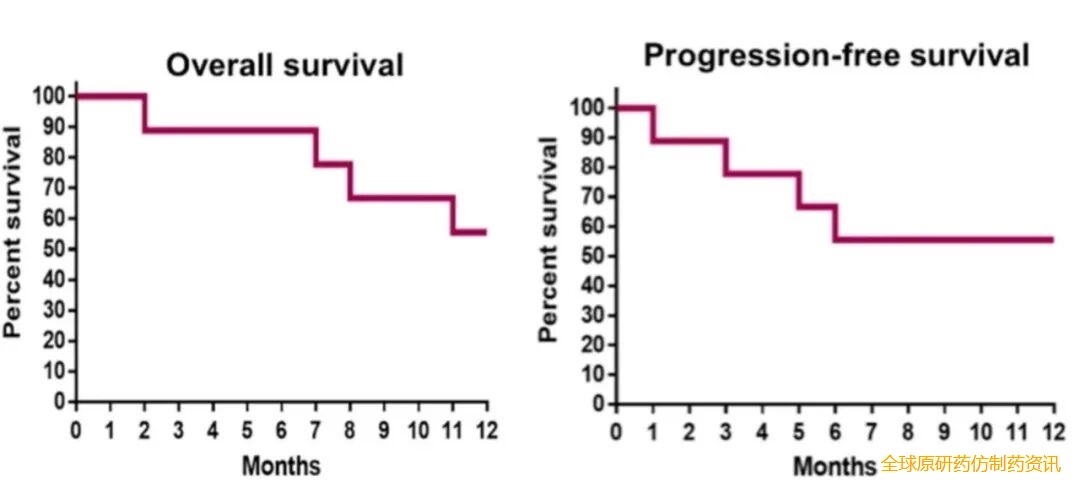 此外,Kaplan-Meier生存分析进一步表明,干预组患者在末次NK细胞注射后12个月的总生存率(OS)与无进展生存率(PFS)均达到45%(详见下图)。