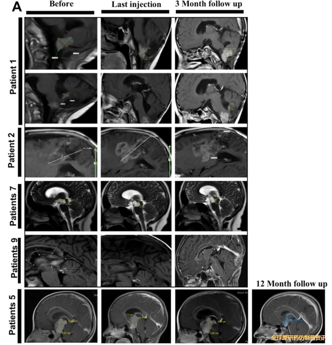疗效可通过肿瘤MRI图像直观验证——如患者7肿瘤大小保持稳定,患者5、9出现部分缓解(详见下图)。