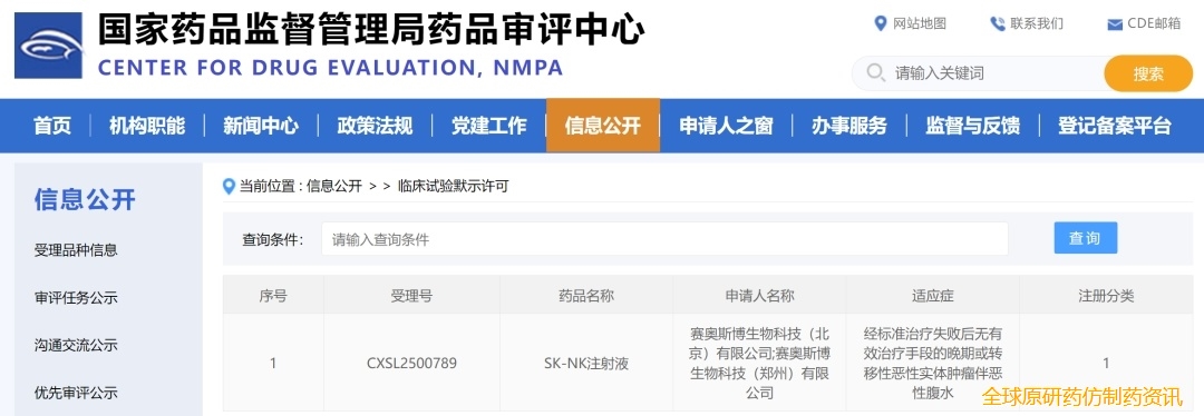 2025年12月4日,SK-NK注射液获国家药品监督管理局药品审评中心临床试验默示许可(IND),适应症为晚期或转移性恶性实体肿瘤伴恶性腹水。