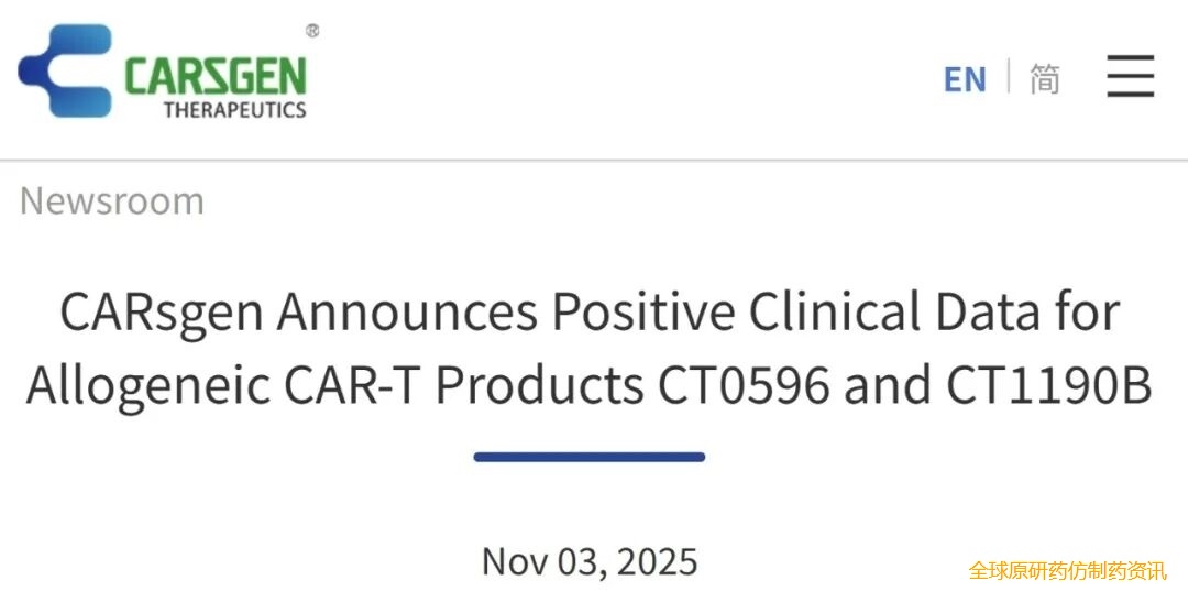 据科济药业(CARSGEN)官网消息,2025年11月3日,两款异基因CAR-T候选药的临床数据正式公布,一款是针对多发性骨髓瘤的CT0596(靶向BCMA),另一款则是针对针对非霍奇金淋巴瘤的CT1190B(靶向CD19/CD20)。