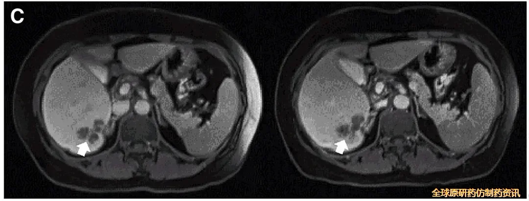结果振奋人心:10例既往治疗进展(PD)的患者中,7例治疗后达到病情稳定(SD),肿瘤直径仅轻微变化,其中2例稳定状态持续超30周(7.5个月)。值得一提的是,其中一个典型病例(P10患者)在接受DL4剂量CEA CAR-T治疗后,MRI证实其肝内一处病灶明显缩小(详见下图)。