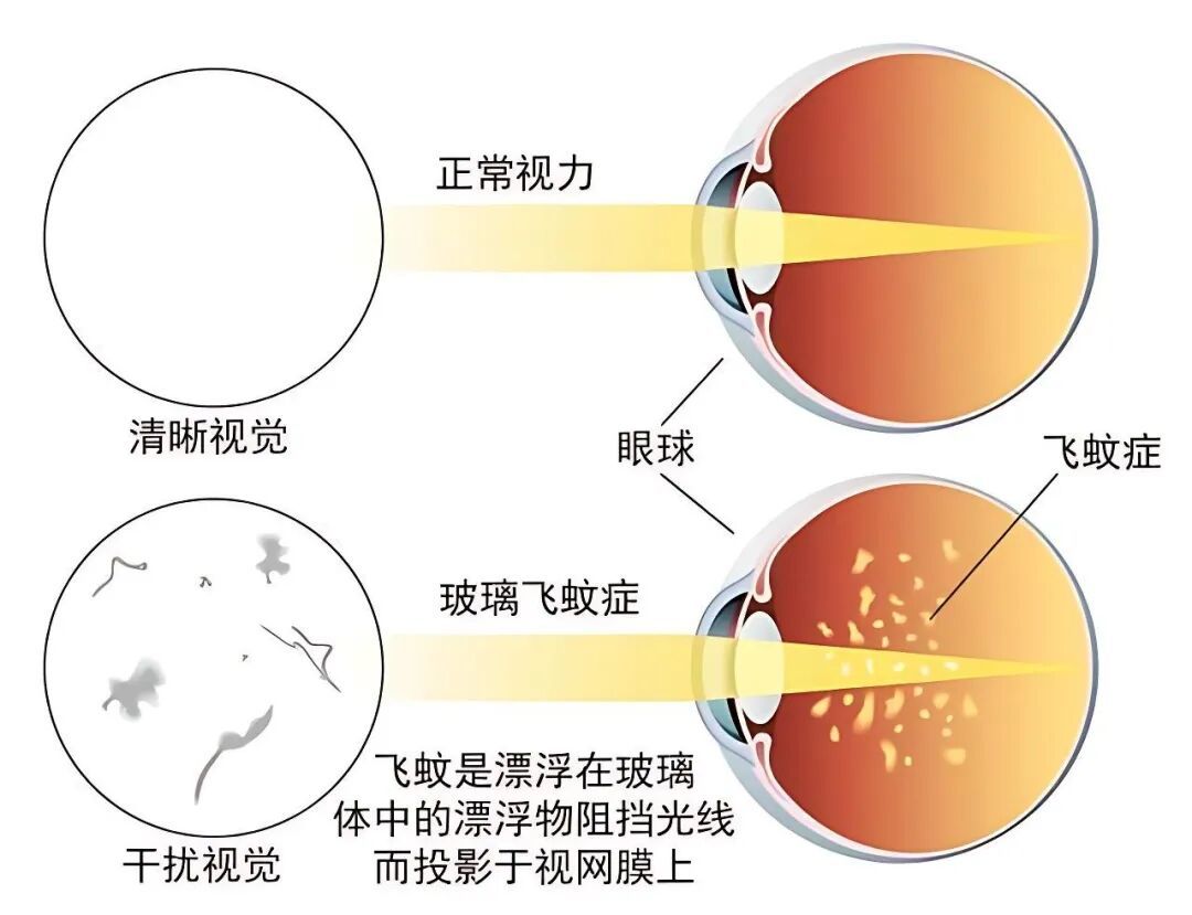 随着年龄的增长,尤其是到了40岁以后,玻璃体会发生自然的“液化”和“变性”过程,部分胶原纤维会聚集、塌陷,进而形成微小的絮状或点状混浊物。当光线穿过时,这些混浊物的阴影会投射在视网膜上,我们就会感知到各种形态的“飞蚊”。而高度近视的人群,由于眼轴更长,玻璃体更容易提前发生变性,所以其发病率远高于常人。