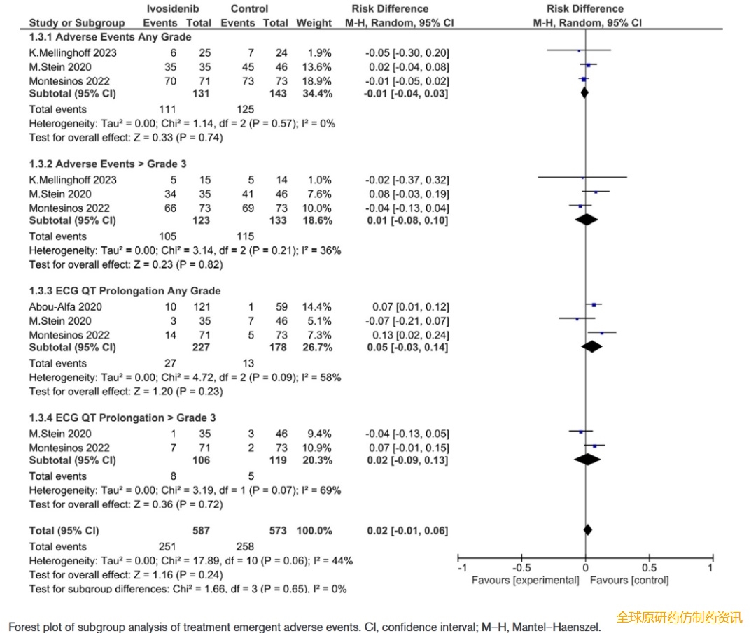 IDH1突变与胆管癌、急性髓系白血病(AML)等恶性肿瘤密切相关,艾伏尼布作为IDH1突变选择性抑制剂,可阻断D-2-羟基戊二酸的合成、恢复细胞正常分化,并抑制肿瘤发生。本研究旨在通过系统评价与荟萃分析,综合评估艾伏尼布在治疗IDH1突变癌症中的整体疗效与安全性。最终纳入4项RCT,共533例患者,其中艾伏尼布组281例,对照组252例,以肝内胆管癌和原发性AML为主。结果显示:艾伏尼布组与对照组的整体治疗中出现的不良事件(TEAE)发生率无统计学差异。对于任意级别的QT间期延长风险,艾伏尼布组与对照组相比,总体效应的风险差(RD)为 0.05,95%置信区间为 -0.03 至 0.14,P值为0.23,I 2= 58%, P = 0.09。3级以上(> Grade 3)的QT延长风险:风险差(RD)为 0.02,95%置信区间为 -0.09 至 0.13。Z值为0.36,P值为0.72,I 2= 69%, P = 0.07。QT间期延长在两组间无统计学差异。