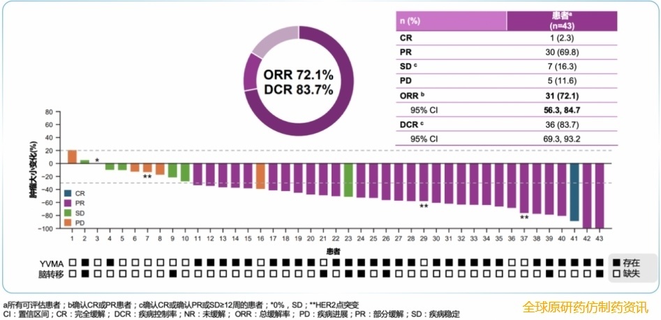 其中43例患者可评估疗效,研究者评估的ORR为72.1%,疾病控制率为83.7%,包括1例完全缓解。44例患者中有16例继续治疗,14例患者的治疗持续时间>12个月,中位缓解持续时间(DoR)为8.7个月,无进展生存期(PFS)为7.5个月。