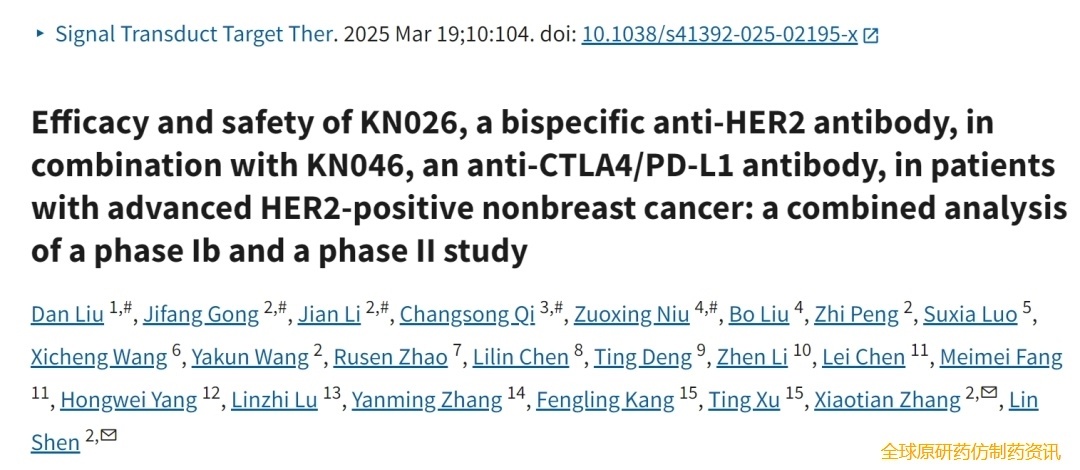 2025年 9 月 11 日,石药集团和康宁杰瑞宣布,双方合作开发的 HER2 双抗 KN026(安尼妥单抗注射液)的新药上市申请已获中国国家药监局受理,适应症为联合化疗用于至少接受过一种系统性治疗(必须包含曲妥珠单抗联合化疗)失败的HER2 阳性局部晚期、复发或转移性的胃/胃食管结合部腺癌。目前 HER2 阳性胃癌二线治疗尚无获批上市的抗 HER2 药物,指南中暂时也未有此类药物推荐,KN026 是中国首个在胃癌二线适应症中获得阳性结果的抗 HER2 双特异性抗体药物。