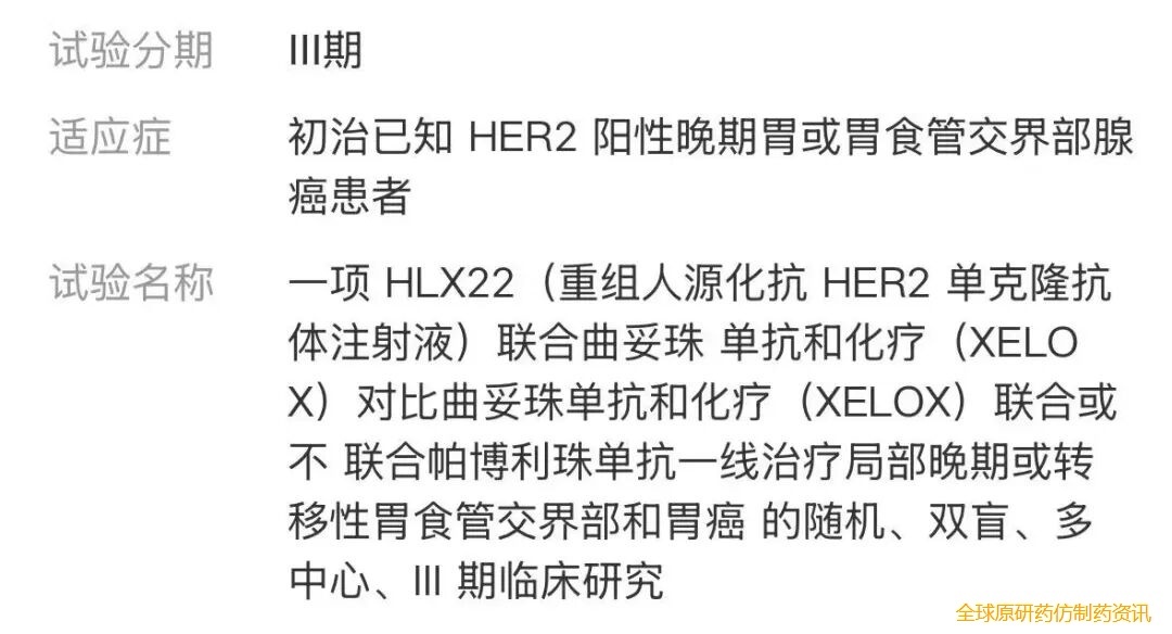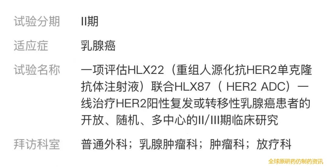 此外针对HER2阳性的乳腺癌一线患者,同样开展了一项HLX22(HER2单抗)联合HLX87(HER2ADC)的临床试验。