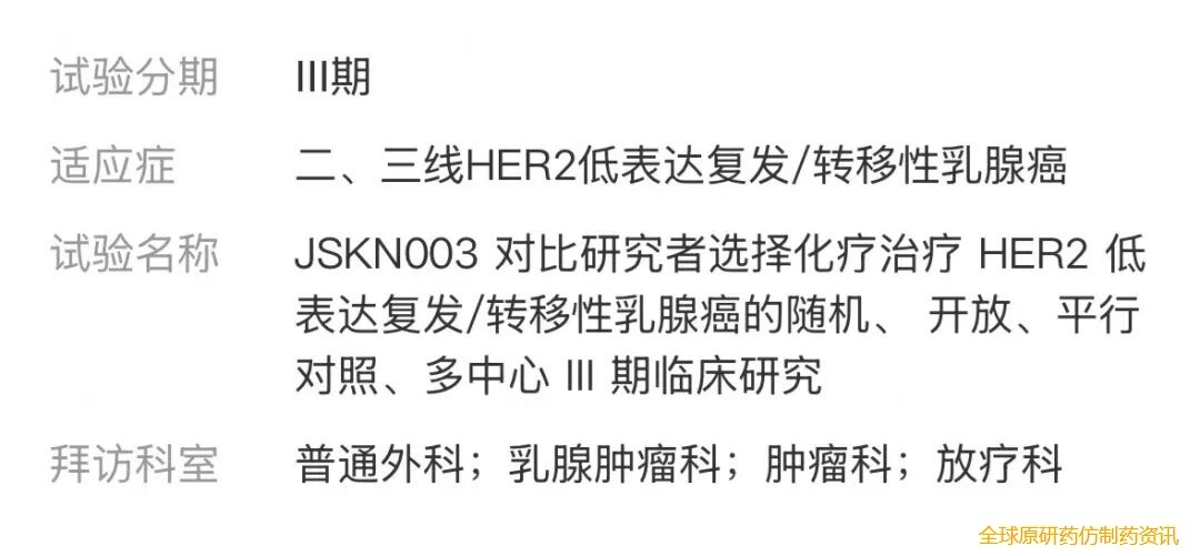 目前此药物还在开展多项临床研究,适应症涉及 HER2 阳性乳腺癌、HER2 低表达乳腺癌、非小细胞肺癌、胆道癌、三阴性乳腺癌 、HER2 阳性胃癌、HER2 阳性结直肠癌。。。。。