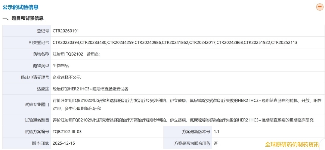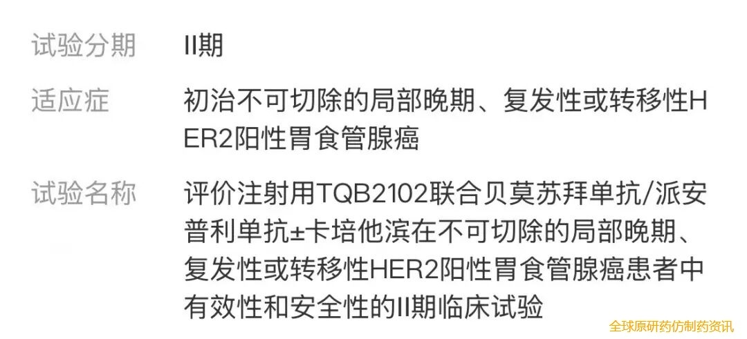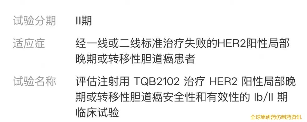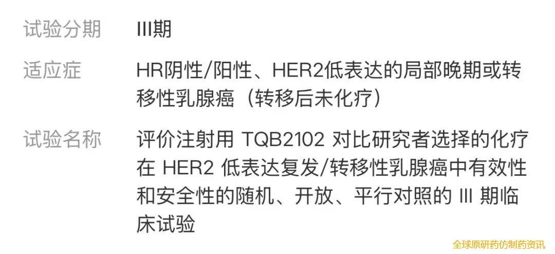 正大天晴正在开展 TQB2102 用于治疗多种肿瘤的临床研究,适应症涉及 HER2 阳性乳腺癌、HER2 低表达乳腺癌、非小细胞肺癌、胆道癌、三阴性乳腺癌 、HER2 阳性胃癌、HER2 阳性结直肠癌等等。在乳腺癌中启动了三项三期临床,本次扩展到结直肠癌的三期临床。