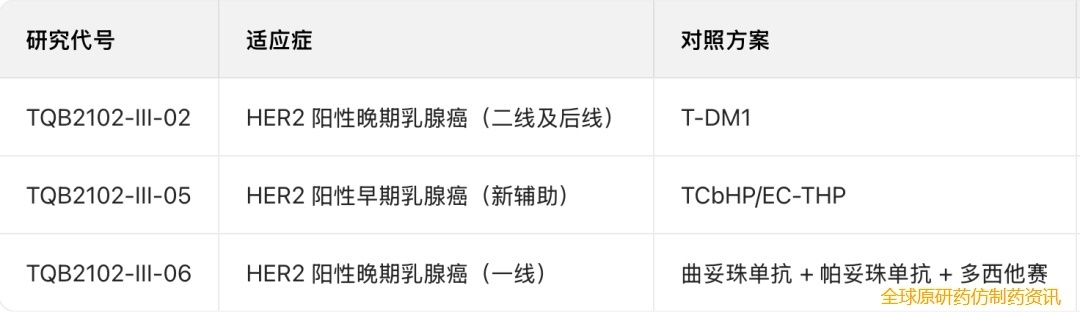 TQB2102-III-02(HER2 阳性晚期乳腺癌,二线及后线)头对头挑战 T-DM1 标准:直接对标抗 HER2 治疗失败后的标准 ADC 方案,以 IRC 评估 PFS/OS 为共同主要终点,旨在打破 T-DM1 的后线治疗垄断。