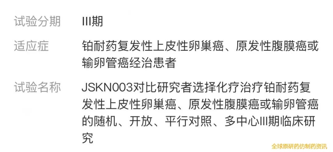 目前,JSKN003有多项注册临床研究正在进行中,包括HER2阳性乳腺癌、全人群铂耐药卵巢癌、HER2低表达乳腺癌、HER2阳性结直肠癌等。