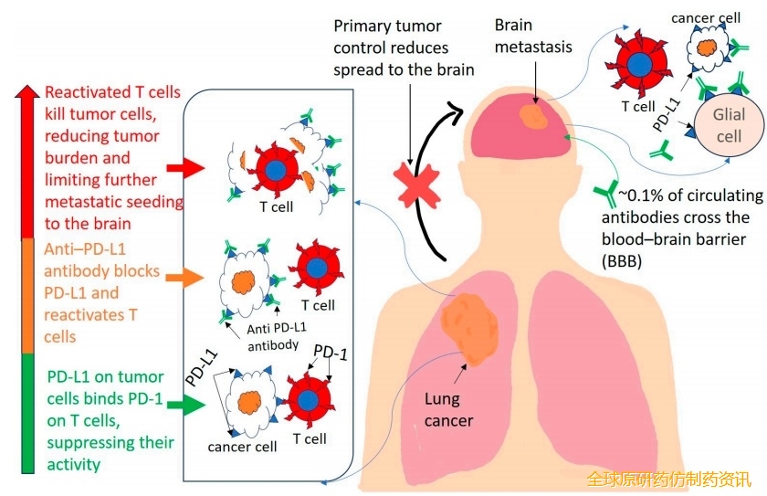 颅内激活:脑转移灶可浸润T细胞,少量穿透BBB的ICI可激活局部T细胞。小胶质细胞/星形胶质细胞在肿瘤微环境中上调PD-L1等配体,ICI可能重编程这些细胞,逆转免疫抑制状态。