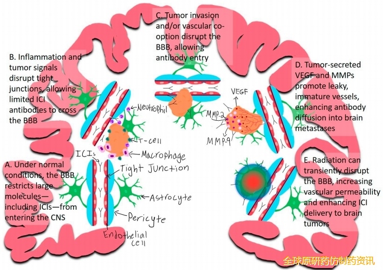 脑转移可通过以下机制增加BBB通透性,促进ICI进入CNS: