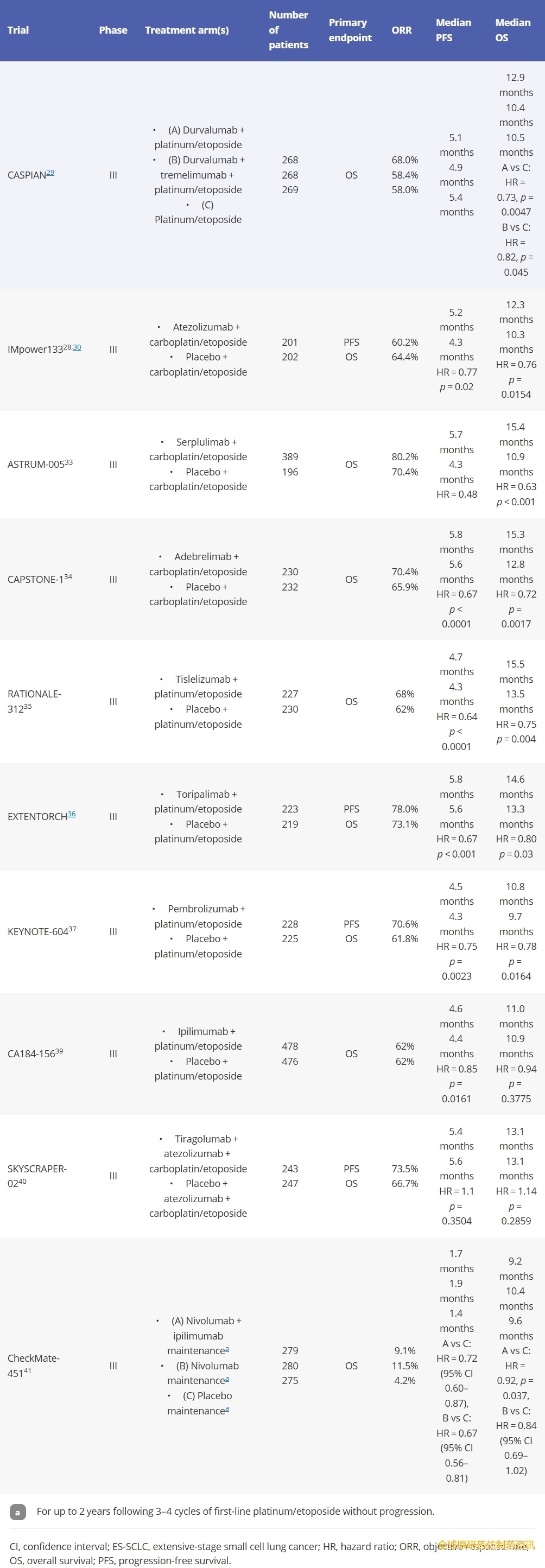 表2.免疫检查点抑制剂联合铂类/依托泊苷化疗一线治疗ES-SCLC的关键临床试验。
