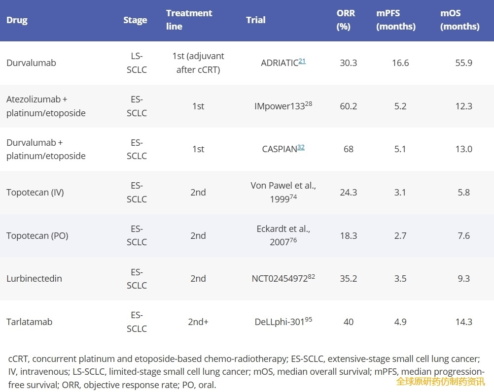表4总结了目前FDA批准的SCLC系统疗法以及临床试验中报告的相关生存结果。