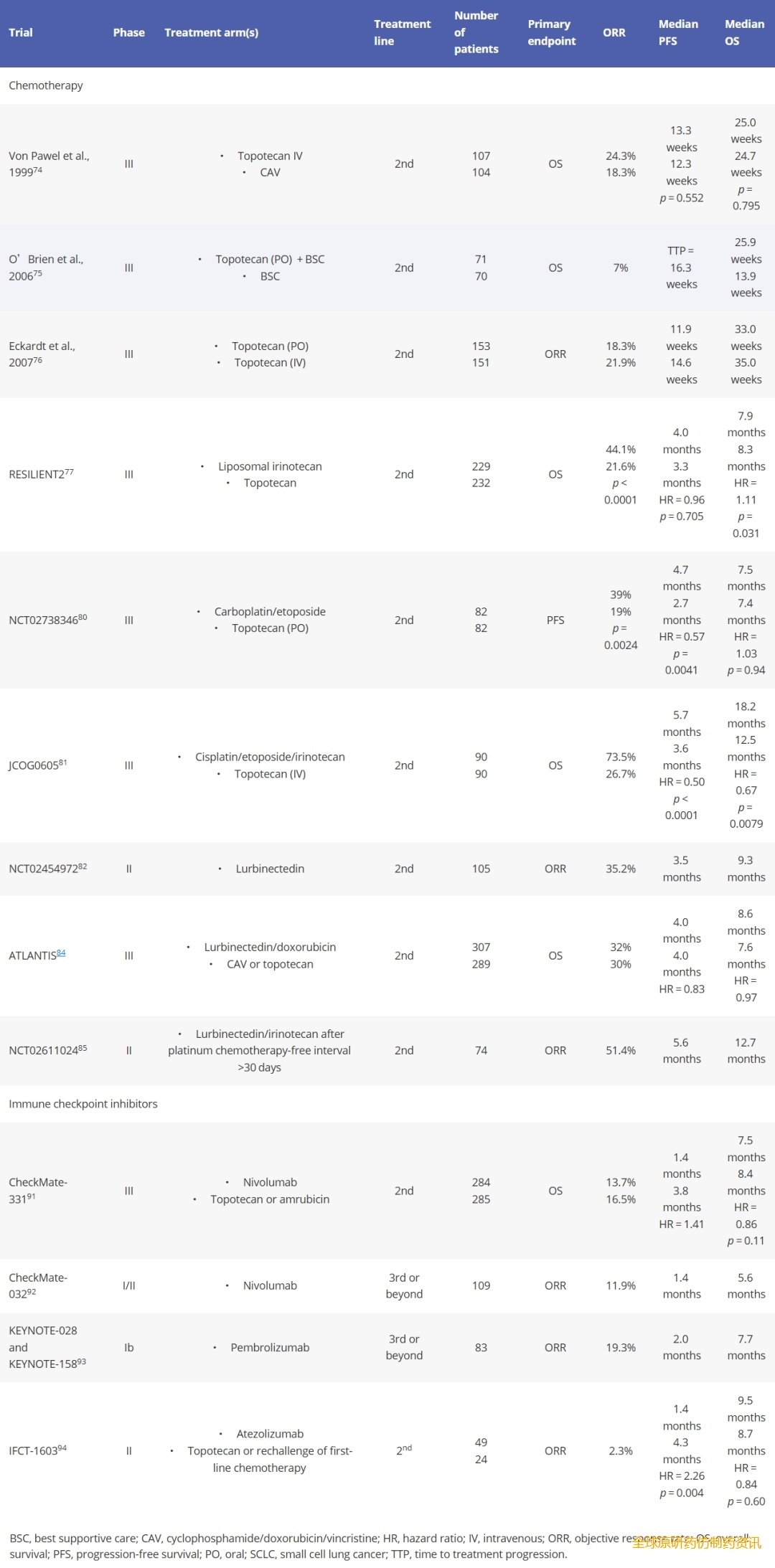 表3. 复发性小细胞肺癌化疗和免疫检查点抑制剂治疗的关键临床试验。