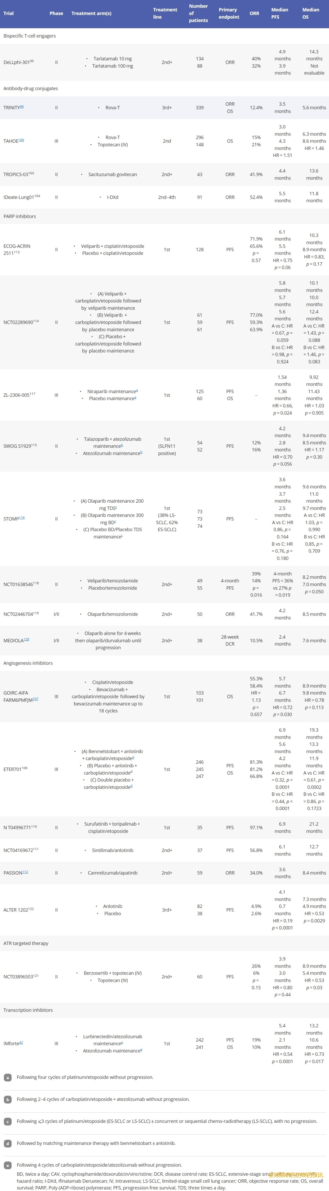 表5. 小细胞肺癌新型系统疗法和联合疗法的关键临床试验。