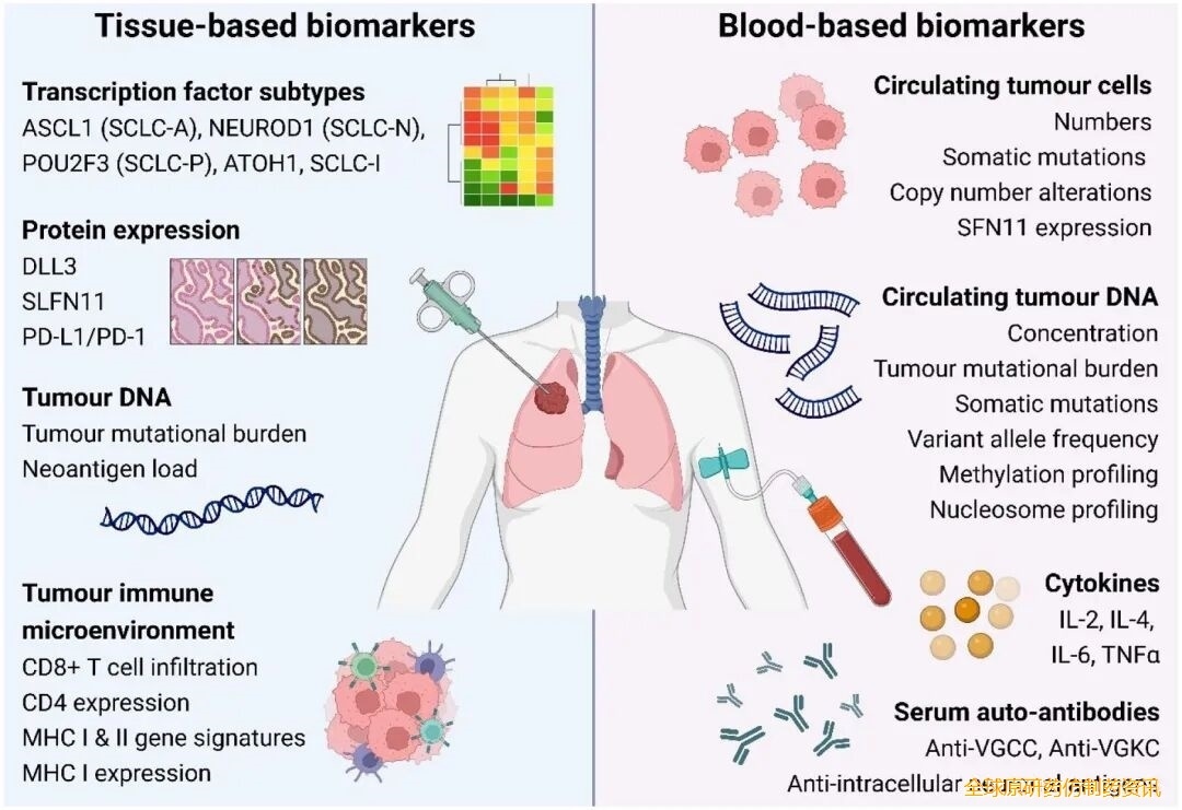 图1. 临床研究中调查的用于小细胞肺癌治疗选择的基于组织和基于血液的候选生物标志物。