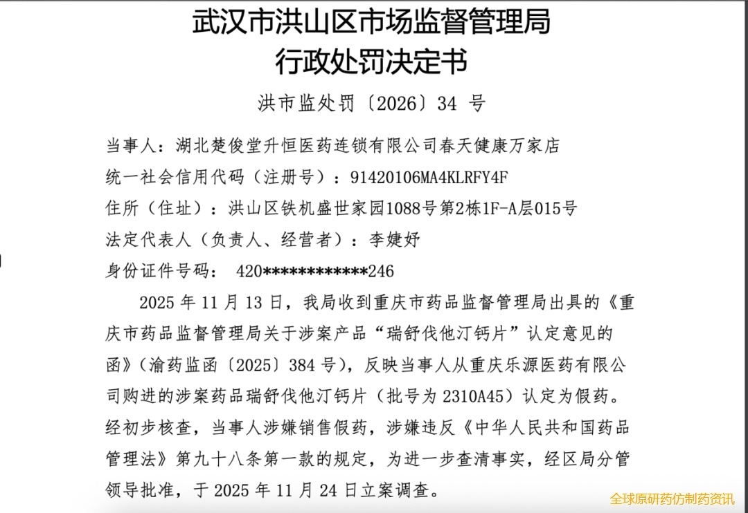 据该行政处罚决定书:2025年11月13日,武汉市洪山区市场监督管理局收到重庆市药品监督管理局出具的《重庆市药品监督管理局关于涉案产品“瑞舒伐他汀钙片”认定意见的函》(渝药监函〔2025〕384号),反映湖北楚俊堂升恒医药连锁有限公司春天健康万家店从重庆乐源医药有限公司购进的涉案药品瑞舒伐他汀钙片(批号为2310A45)被认定为假药。