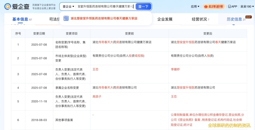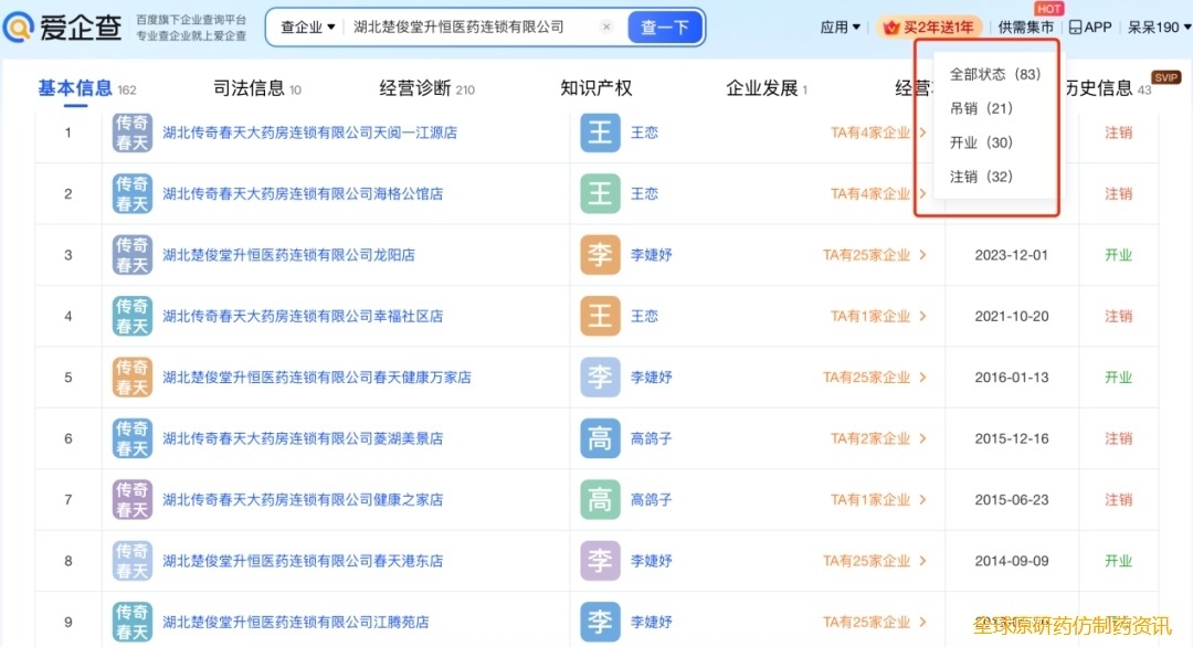 而据《爱企查》资料,该门店的母公司湖北楚俊堂升恒医药连锁有限公司成立于2008年04月14日,注册地位于湖北省武汉市汉阳区龙阳大道108号五栋3楼A01-A05室、4楼A01-A19室、5楼501-512室,法定代表人为戴春俊。戴春俊也是该公司持股99%的控股股东。该公司原名湖北传奇春天大药房连锁有限公司,于2025年6月更改为现名。累计开设门店83家,已经注销32家,被吊销21家,现有30家门店显示为开业状态。但是据我们的了解,该公司虽然形式上是直营门店形式,但是疑似实际上多为加盟管理。