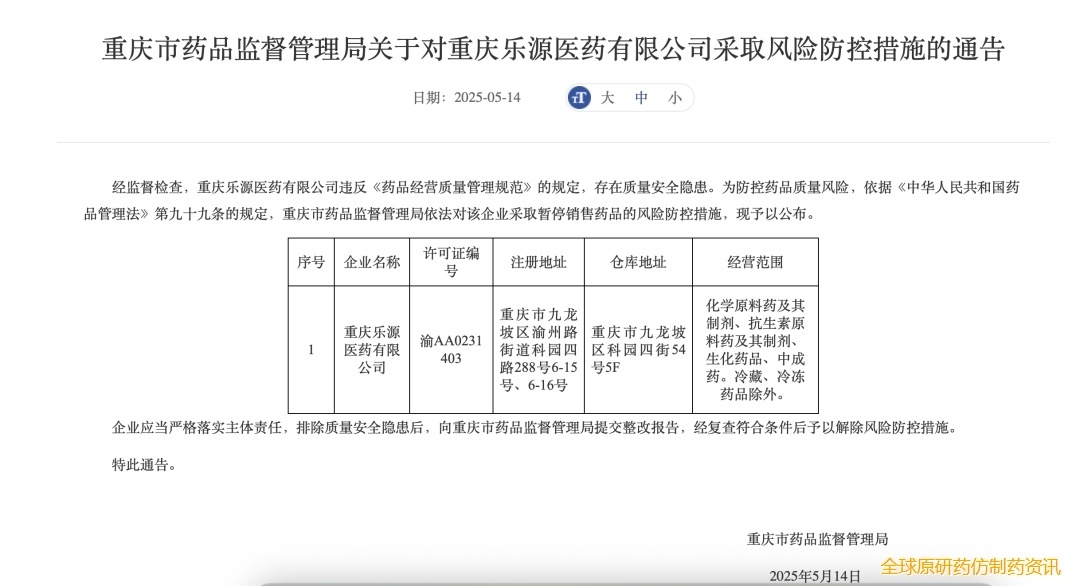 据重庆市药监局官网2025年5月14日发布的《重庆市药品监督管理局关于对重庆乐源医药有限公司采取风险防控措施的通告》:经监督检查,重庆乐源医药有限公司违反《药品经营质量管理规范》的规定,存在质量安全隐患。为防控药品质量风险,依据《中华人民共和国药品管理法》第九十九条的规定,重庆市药品监督管理局依法对该企业采取暂停销售药品的风险防控措施。截至本文发布时,我们在重庆市药监局官网上并没有找到该公司被解除暂停销售药品风险防控的通告,也没有找到对该公司的处罚。